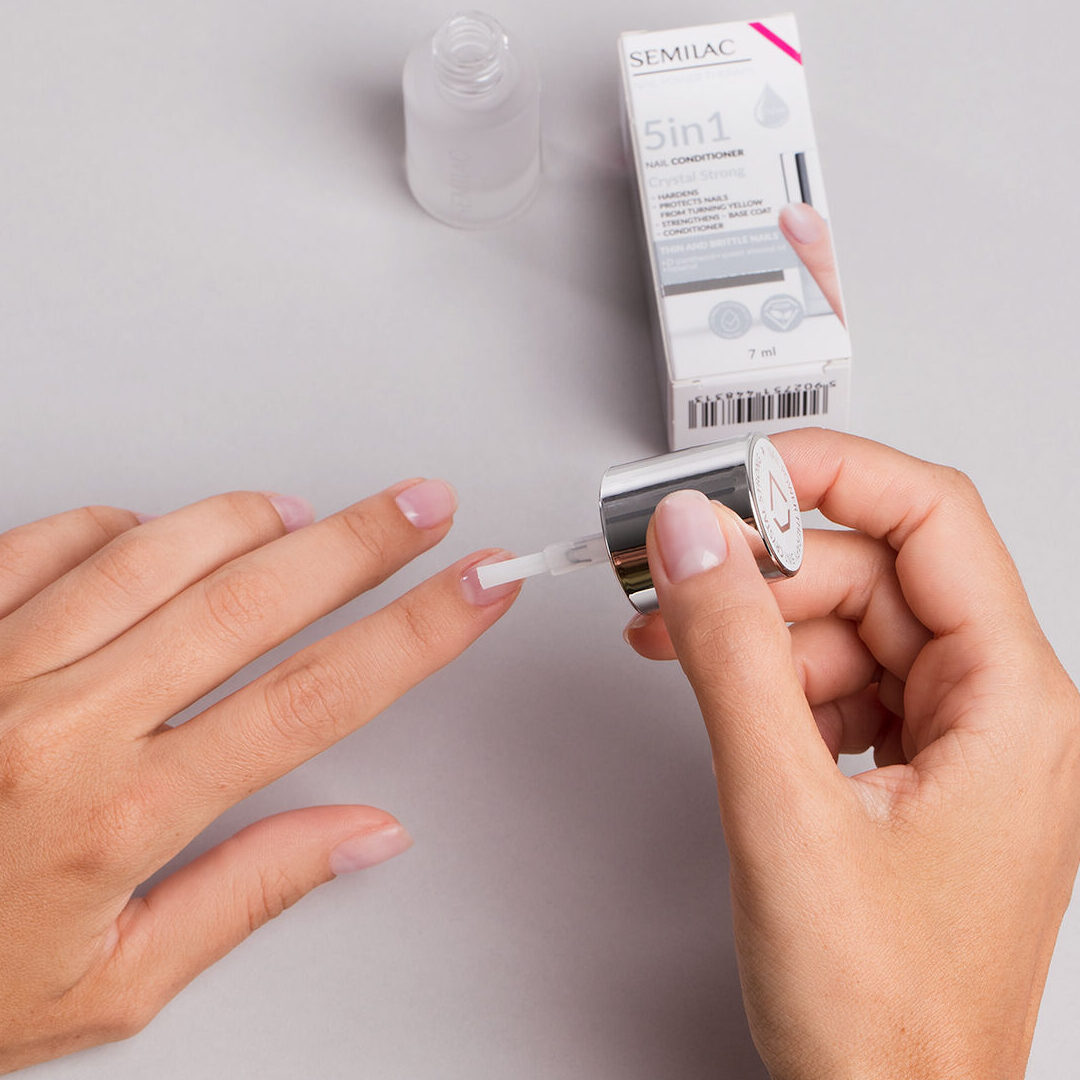 Tragen Sie eine dünne Schicht Basislack auf Ihre Nägel auf. Dieser sorgt für eine bessere Haftung des Semilac Nagellacks und schützt Ihre Nägel vor Verfärbungen.